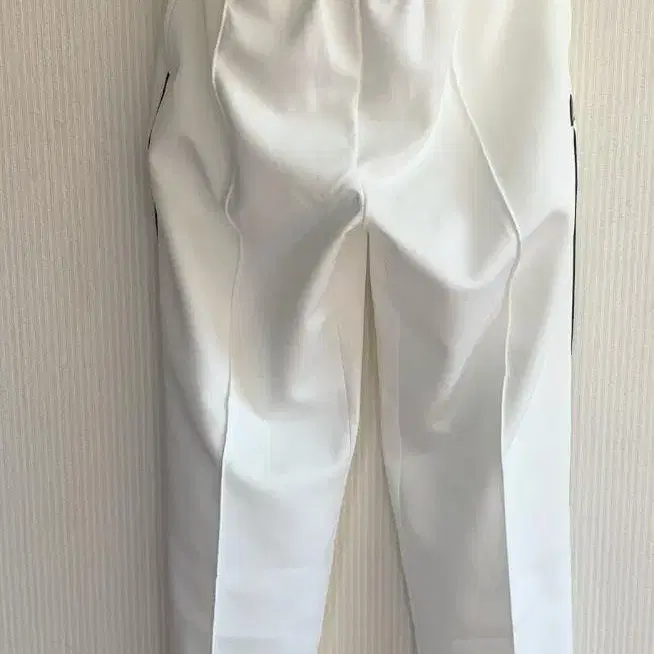 1회 착용. 새상품급 중고. 사이드 라인이 특징인 유럽풍 화이트 조거 팬츠. 센터 플리츠가 있어 저지 소재임에도 깔끔하게 연출됩니다! 밑단은 슬릿 지퍼로 개폐 가능합니다. 매끈매끈한 깔끔한 소재.