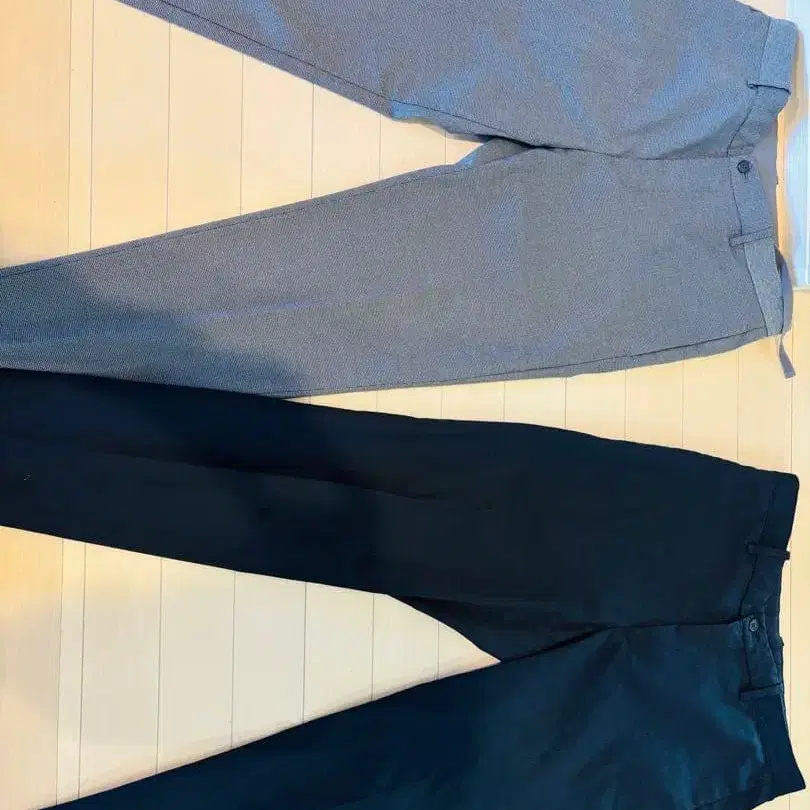그레이와 네이비 색상의 앵클 슬랙스, 백 포켓이 있어 스타일리시합니다.
