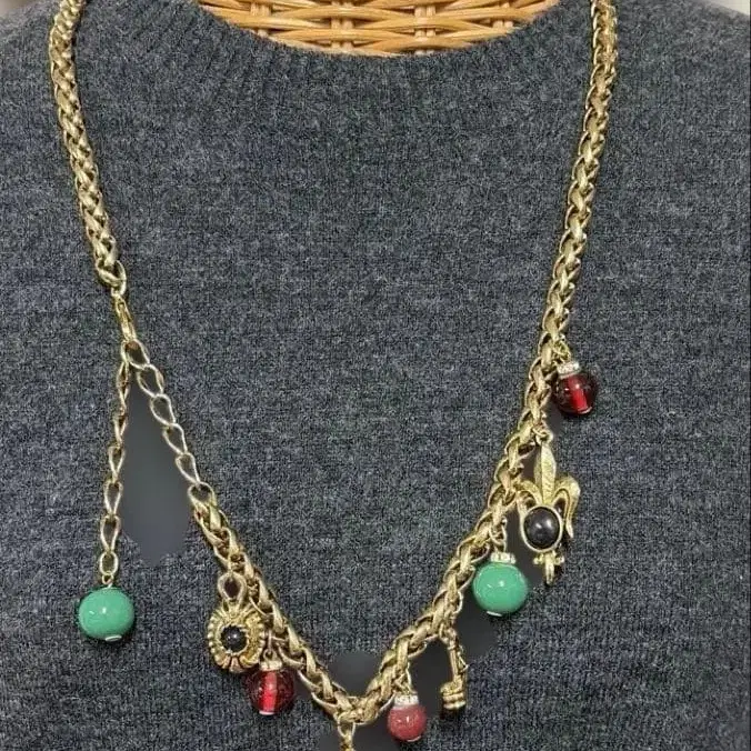 무게감 있는 다채로운 참이 특징인 골드 톤 목걸이.
