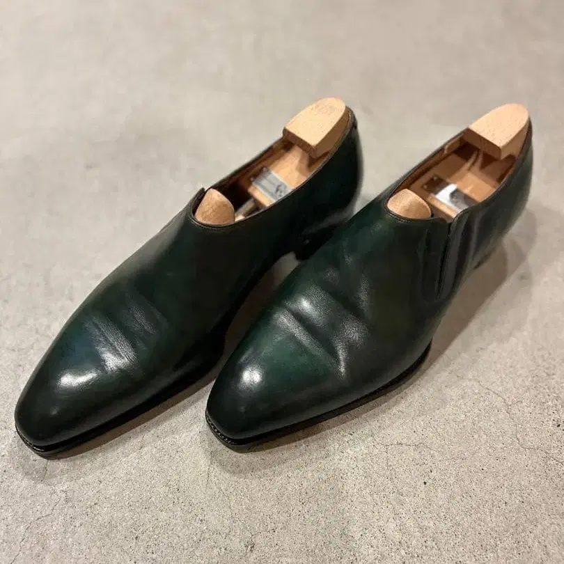 다크 그린 색상의 가죽 슬립온입니다. 스틸레토 디자인으로 세련된 스타일을 연출합니다. DECO 라스트를 사용하여 일반 모델보다 고품질의 가죽으로 제작되었으며, 가볍게 닦기만 해도 빛이 납니다. 촉촉한 가죽이라 부드럽고 발에 잘 맞습니다. 사용 횟수는 10회 정도로 아직 깨끗합니다. 현재 출시되지 않는 모델이라 매우 레어한 모델입니다. 슈트리는 부속되지 않습니다. - 색상: 다크 그린 - 소재: 가죽 - 디자인: 슬립온 - 모양: 스틸레토 - 밑창: 가죽 밑창 방문해 주셔서 감사합니다.