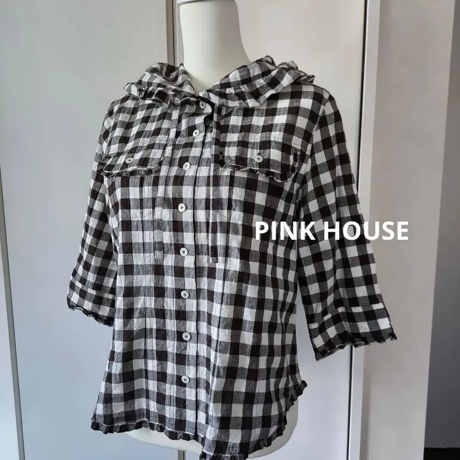 컨디션 최상 핑크하우스 블라우스 티셔츠 체크 7부 소매 후드 부착 셔츠