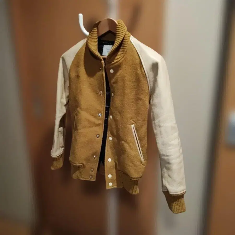 브라운과 크림 색상의 바시티 자켓, 폴리에스테르 소재로 가볍고 따뜻합니다. - 색상: 브라운/크림 - 스타일: 바시티 자켓 - 소재: 겉감: 폴리에스테르 100%, 안감: 나일론 100%, 충전솜: 폴리에스테르 100%, 소매 가죽 방문해 주셔서 감사합니다.