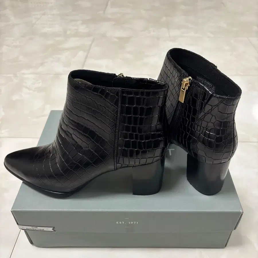 새상품 미사용 크로커다일풍 지퍼 부츠. - 색상: 블랙 - 소재: 크로커다일풍 합성 피혁 - 굽 높이: 중간 굽 - 디자인: 지퍼 포함 - 스타일: 부츠 방문해 주셔서 감사합니다.
