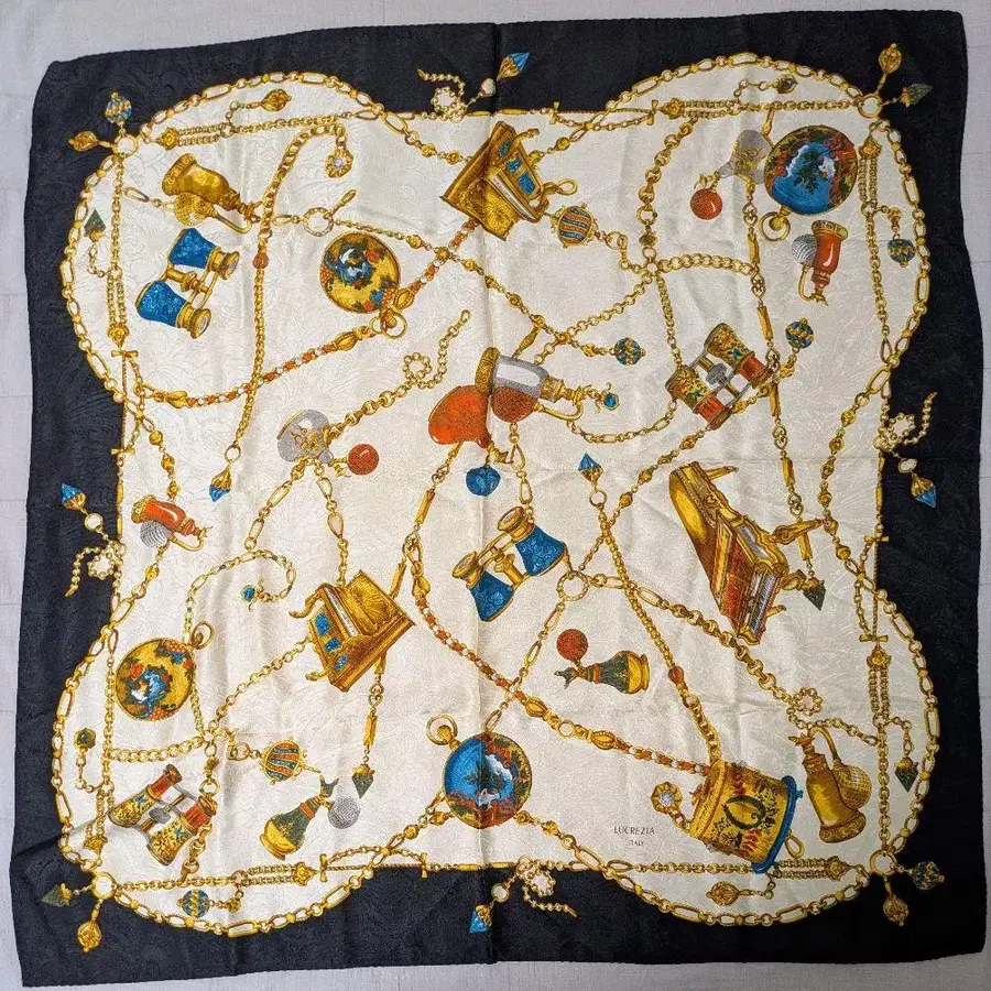 바로크 패턴 (주얼리, 악기, 지구본 등을 모티브로 한 올 패턴) 디자인이 특징인 클래식한 스카프