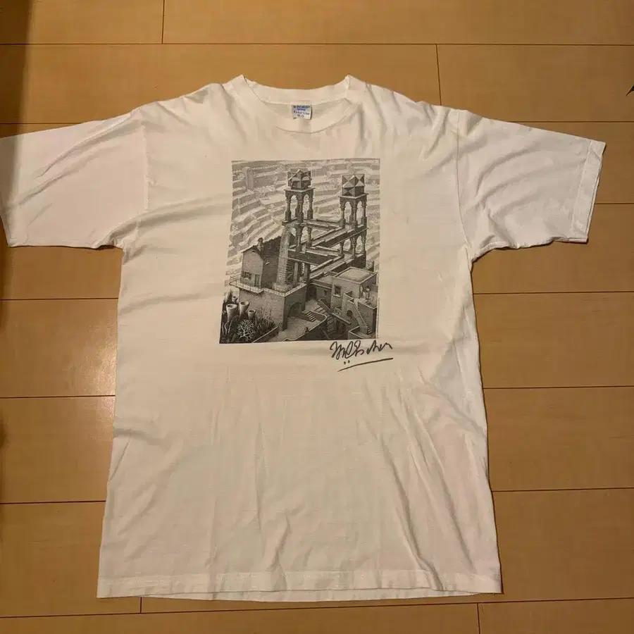 90년대 M.C. 에셔 흑백 아트 폭포 티셔츠 XL