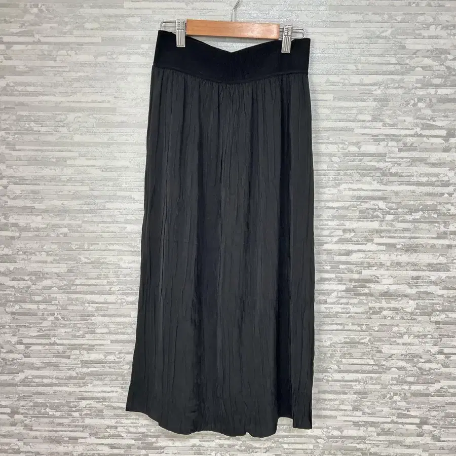 Theory의 리브 허리와 가벼운 플리츠 원단의 콤비 디자인이 특징인 롱 스커트.