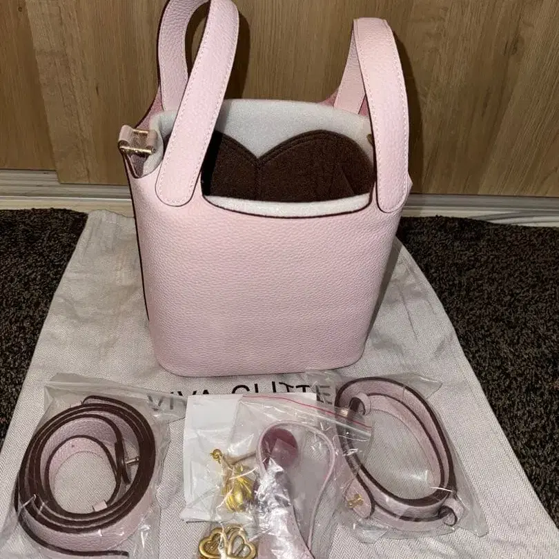 페이지를 봐주셔서 감사합니다. viva glitter의 버킷 백입니다. 스트랩과 참 포함. 미사용 새상품이지만, 자택 보관이므로 완벽한 상태를 원하시는 분은 삼가해 주시기 바랍니다. - 색상: 핑크 - 소재: 가죽 - 부속품: 스트랩, 참 - 디자인: 버킷 백