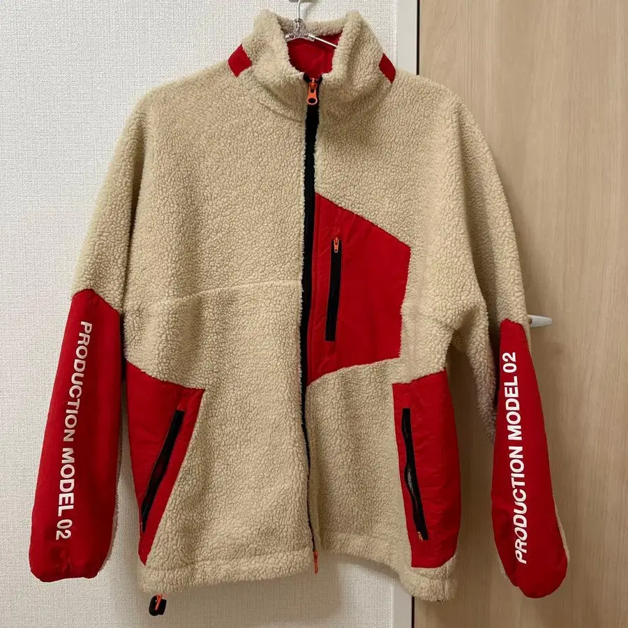 플리스 소재로 따뜻하고 개성 있는 디자인의 자켓. - 브랜드: RADIO EVA - 모델명: PRODUCTION MODEL 02 - 색상: 베이지/레드 - 소재: 플리스 - 제조국: 일본 방문해 주셔서 감사합니다. 색상 - 레드 계열 얼룩, 찢김, 냄새 등 - 없음