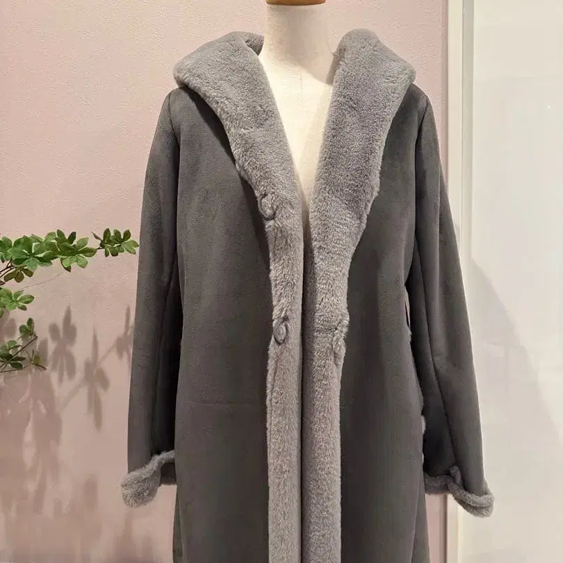 La Leia 그레이 무스탕 롱 코트 후드 부착