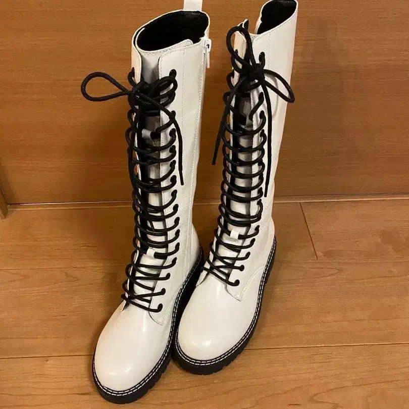 새상품 가격표 포함 화이트 레이스업 롱 부츠 M