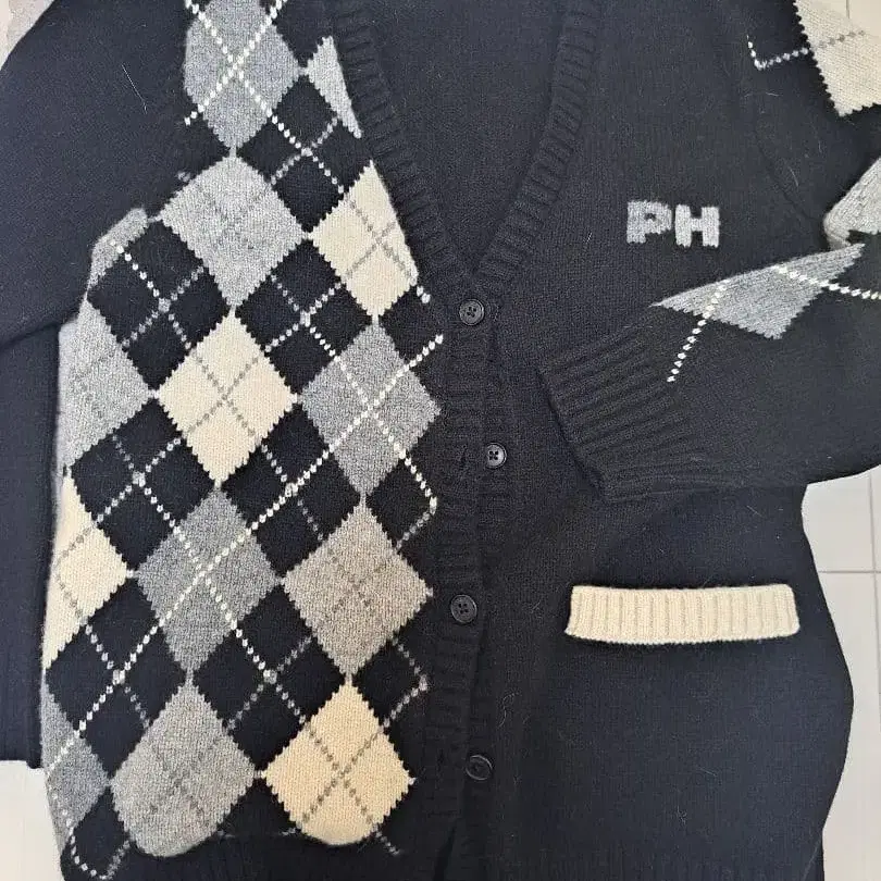 아가일 디자인의 네이비 가디건, 포켓이 있어 스타일리시합니다. 약간 두꺼운 원단이지만 튼튼해서 아우터로도 좋을 것 같습니다. 저희 집에는 고양이가 있어서 블랙은 입을 수 없다고 포기했습니다. 한 번도 입은 적이 없습니다.
