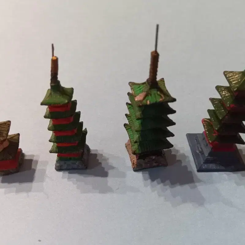 분재, 분경, 디오라마 등의 풍경에 사용하기에 추천하는 것으로, 청동제로 보이는 오층탑 3개와 다보탑 1개입니다. 오층탑은 높이 45mm인 것이 2개, 높이 39mm인 것이 1개, 다보탑은 높이 26mm입니다. 오래된 것이지만, 지붕은 그린으로, 당은 빨간색으로 채색되어 있으며, 매우 섬세한 조형으로, 섬세한 피규어입니다. 꽤 작은 물건이지만, 파손되지 않도록 택배로 보내드릴 수 있도록 생각하고 있습니다.