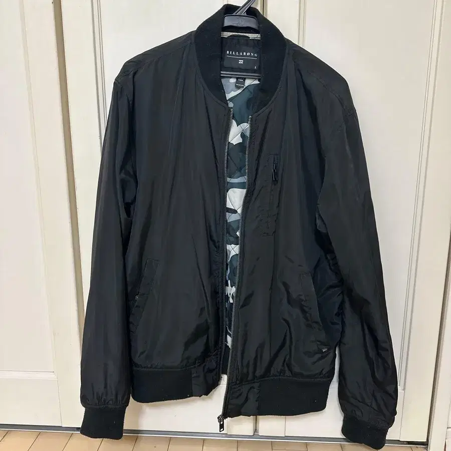 빌라봉 MA-1 사이즈 L 컬러 블랙 바스락 소재 뒷면은 퀼팅 소재 그레이 계열 카모 패턴 양쪽 사이드 포켓 가슴에도 포켓 소매, 밑단은 리브 소재 #서핑 #점퍼 #블루종 #MA-1 #밀리터리 #플라이트 자켓