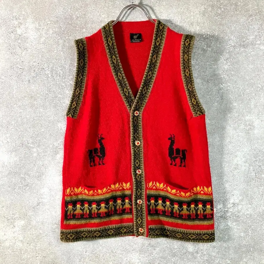 ALPACA 니트 베스트 레드 V넥 올 패턴 스웨터 겉옷 페루제