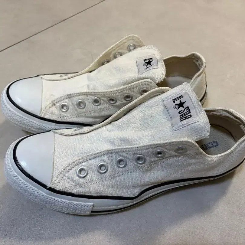 CONVERSE의 ALL STAR SLIP FE OX, 색상은 화이트, 사이즈는 US 8 (JPN 26.5cm)입니다. 꼼꼼하게 관리했기 때문에 얼룩이나 흠집은 없다고 생각합니다. 다만, 걸음걸이가 좋지 않아 뒤꿈치 마모가 좌우에서 약간 다릅니다. 판매를 위해 신발 클리닝을 진행했습니다. 비흡연, 반려동물 없음, 자택 옷장 보관입니다. - 브랜드: CONVERSE - 사이즈: US 8 (JPN 26.5) - 색상: 화이트 - 스타일: 올스타 슬립온 방문해 주셔서 감사합니다. 메인 컬러 - 화이트 모델명 - 올스타 실루엣 - 로우컷/OX 소재 - 캔버스 얼룩, 찢김, 냄새 등 - 없음