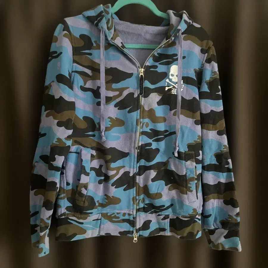 파랑과 블랙 카모플라쥬 디자인의 풀 집업 후드티, 스컬 프린트 포함. - 색상: 카모플라쥬 - 디자인: 풀 집업, 후드 부착 - 특징: 스컬 프린트 - 포켓: 앞면에 큰 포켓 있음 방문해 주셔서 감사합니다.