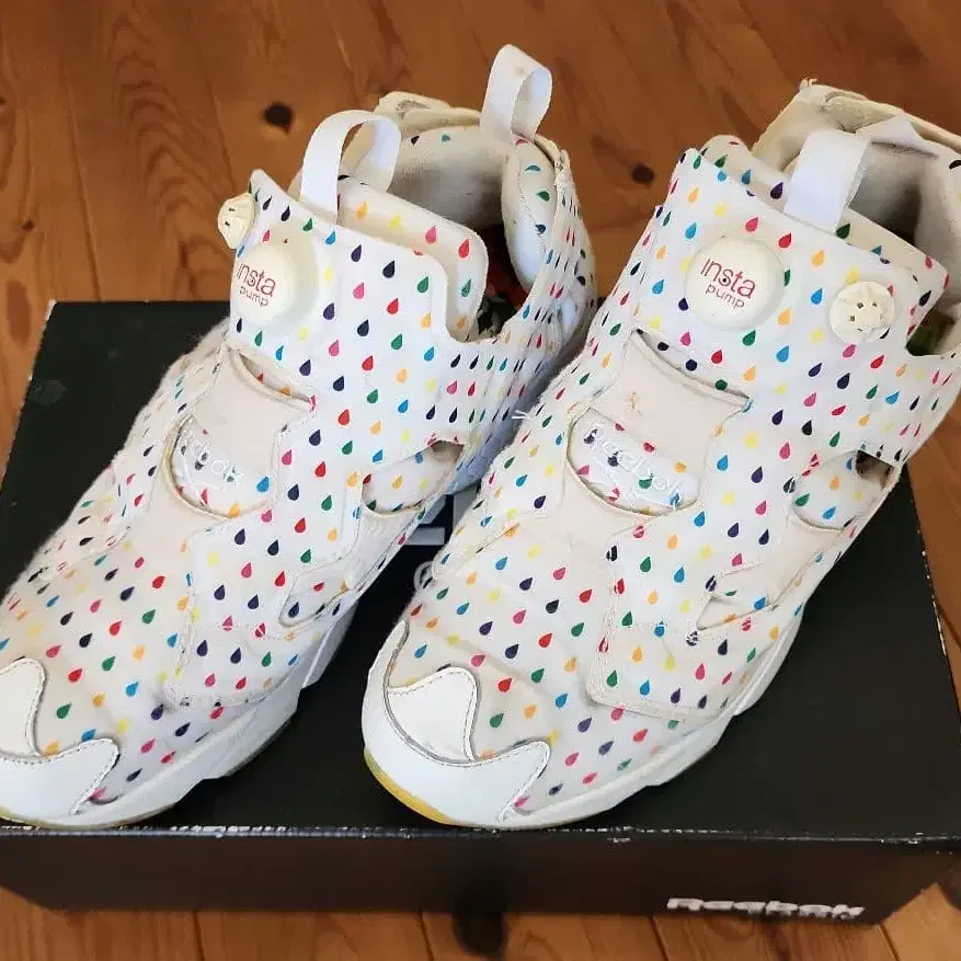 리복의 인스타펌프입니다. 레인보우 드롭 패턴으로 매우 귀여운 디자인입니다. 베이스 색상이 화이트라서 약간의 얼룩이나 색 바램이 있습니다. 상자도 함께 드리지만 이 상품의 상자는 아니니 양해 부탁드립니다.