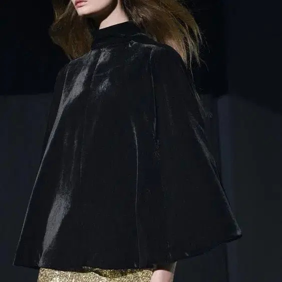 하이넥 벨벳 소재 케이프. 동색 안감 부착. 프론트 메탈 후크 여밈. 인기 완판템. 겉감 97% 폴리에스테르 3% 폴리우레탄 안감 100% 폴리에스테르 사이즈 M 기장 약 60cm 소매는 없지만 화장 길이에 해당하는 길이가 약 73cm입니다. 얼룩, 찢김, 냄새 등 - 없음 색상 - 블랙 계절감 - 겨울, 가을, 봄