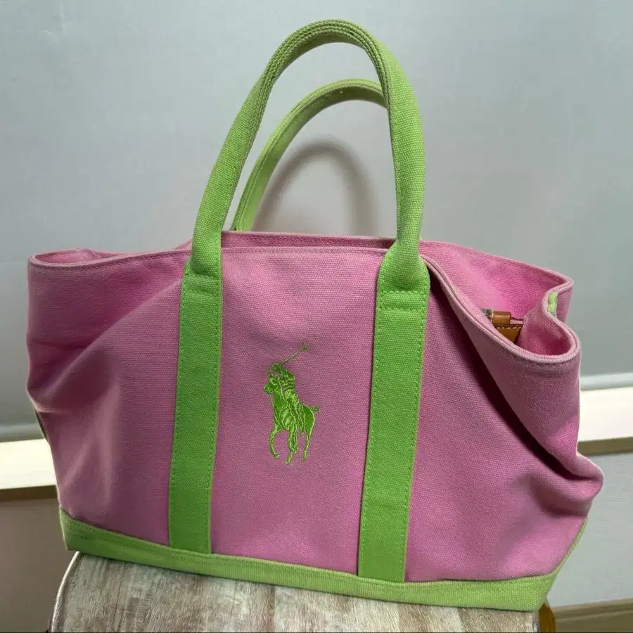 랄프 로렌 포니 토트백 핑크 x 그린 미디엄 사이즈