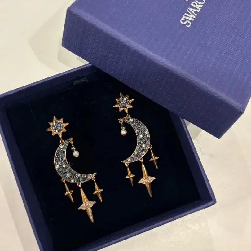 파란색 크리스탈과 골드 색상의 달, 별 디자인 드롭 귀걸이, 전용 박스 포함. - 브랜드: SWAROVSKI - 디자인: 달과 별 모티브 - 소재: 크리스탈, 금속 - 색상: 파랑, 골드 - 스타일: 드롭 귀걸이 - 부속품: 전용 박스 방문해 주셔서 감사합니다. 해외에서 구매했지만, 한 번도 착용할 기회가 없어 집 안에서 보관했습니다. 중고품에 이해해 주시는 분 부탁드립니다. 색상 - 네이비 계열 귀걸이 형태 - 캐치 스터드 부속품 - 상자, 보증서 흠집, 변색 등 - 없음