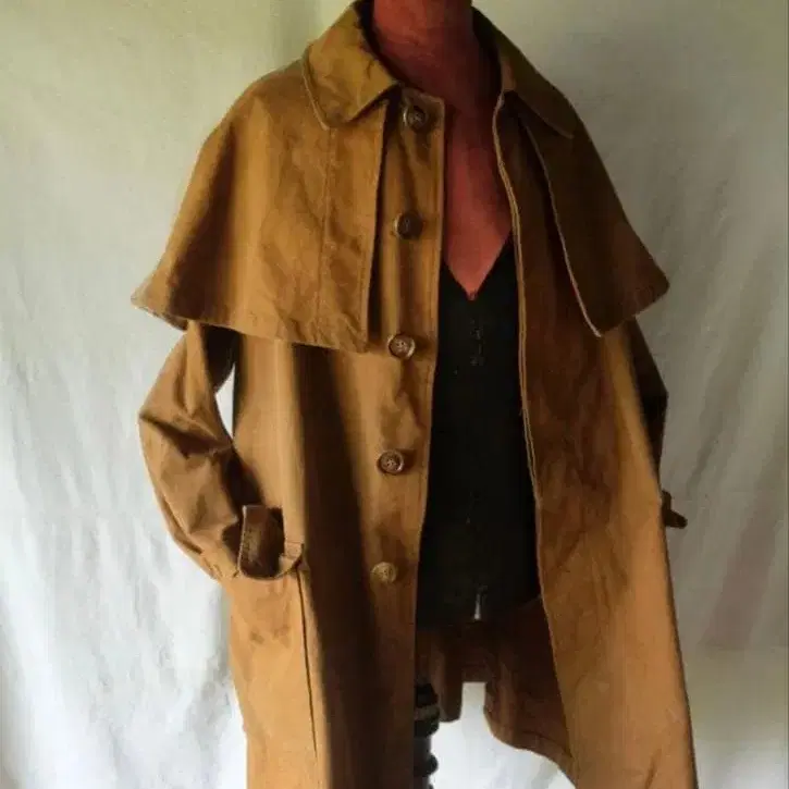 1930-40s 케이프 탈부착 헌팅 코트입니다. 케이프는 탈부착 가능합니다. 깊은 오커 브라운 색상의 탄탄한 코튼 린넨 캔버스 원단으로, 튼튼하고 다루기 쉬운 훌륭한 질감의 원단입니다. 둥글게 커브진 납작한 옷깃, 버튼 탈부착식 숄더 케이프, 히든 버튼 여밈 프론트, 긴 소매 스트랩, 플랩이 달린 큰 패치 포켓이 허리 좌우에 있으며, 깊은 사이드 슬릿도 분위기를 더합니다. [ 사이즈 ] 어깨 너비: 47cm 가슴 너비: 62cm 기장: 92cm 소매 길이: 62cm ※ 개인 측정으로 인해 약간의 오차는 용서해 주십시오. [ 상태 ] 등 쪽 케이프를 달면 가려지는 위치에 눈에 띄지 않을 정도의 작은 수선 자국이 보이지만, 그 외 찢김 등은 없는 좋은 상태입니다.
