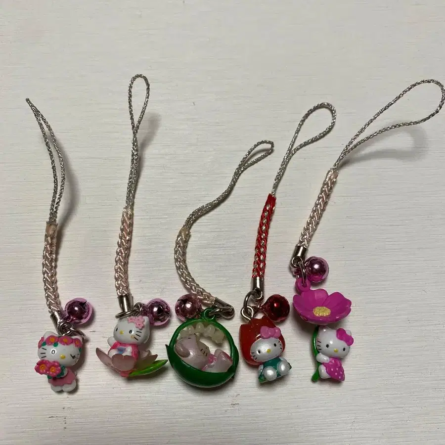 헬로키티가 꽃과 꽃의 정령으로 분장한 디자인의 스트랩 5개 세트. 오랫동안 집에서 보관했기 때문에, 약간 잉크? 얼룩이 묻어 있습니다. 미사용이기 때문에 끈 부분도 깨끗합니다. 방문해 주셔서 감사합니다.