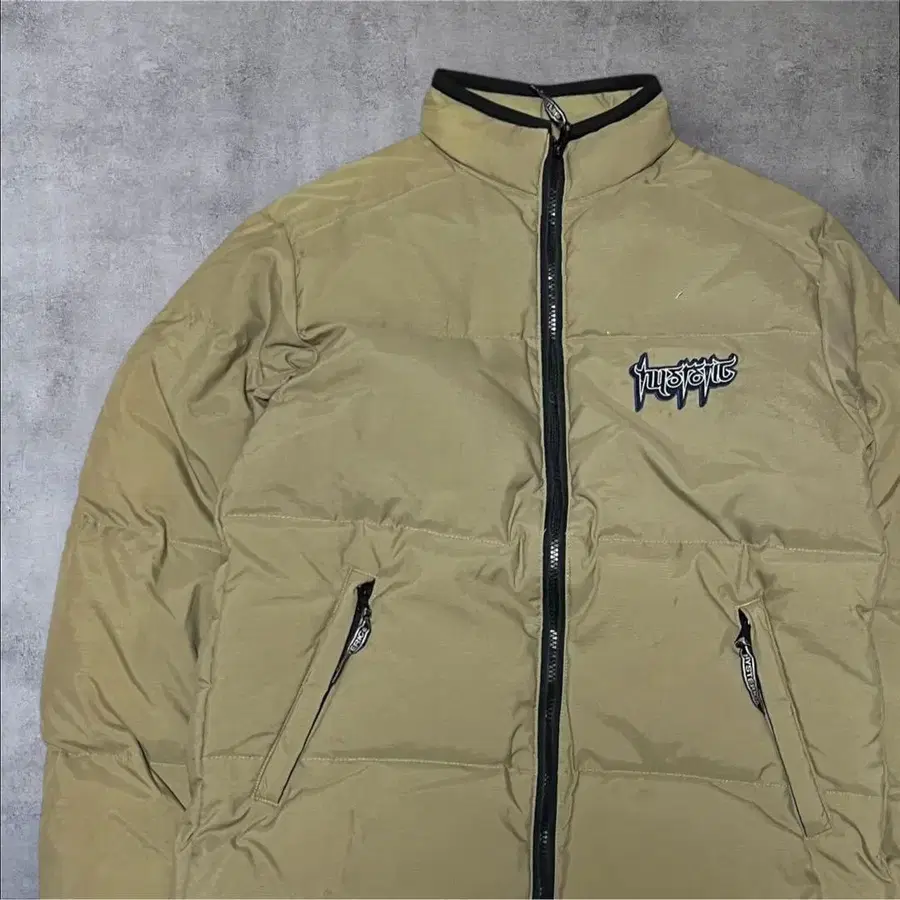 스탠드 카라의 베이지 다운 자켓, 프론트에 자수 로고 포함.