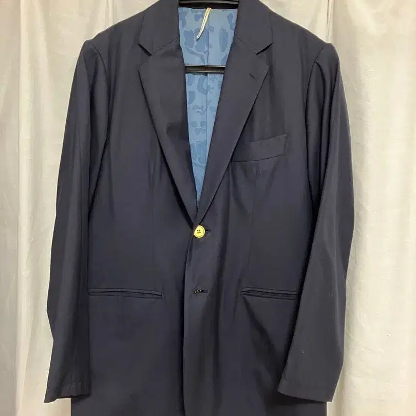 자동 번역되었어요. 원문보기심플한 네이비 테일러드 자켓, 골드 컬러 버튼 포함.