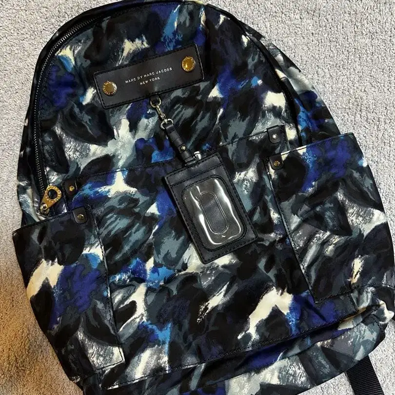 - 브랜드: 마크제이콥스 - 색상: 파랑과 블랙의 추상적인 패턴 - 포켓 수: 외부에 3개의 포켓 - 안쪽 소재: 블랙 나일론 소재 - 스트랩: 조정 가능한 숄더 스트랩