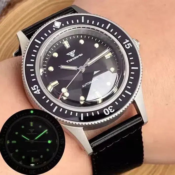 자동 와인딩 기능을 탑재한 블랙 다이얼의 나일론 벨트 손목시계. - 브랜드: Tendorio - 색상: 블랙 - 기능: 자동 와인딩 - 벨트 소재: 나일론 - 다이얼 모양: 라운드 - 방수 성능: 있음 - 빛나는 기능: 야광 인덱스 방문해 주셔서 감사합니다.