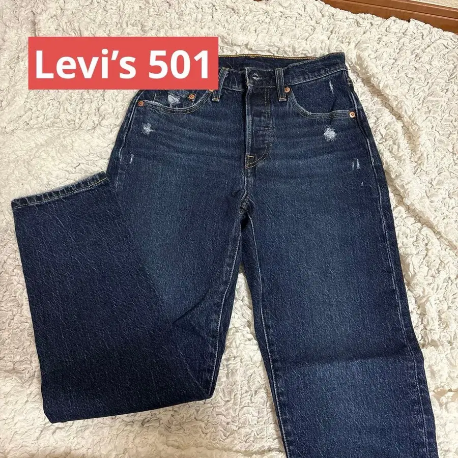 리바이스 501 데님입니다. 미사용 상태로 자택 보관 중입니다. 약간의 데미지 가공이 되어 있습니다. W25 L28 평소 UNIQLO 턱 와이드 팬츠 M 사이즈를 입는데, 적당한 크기였습니다. 궁금한 점이 있으시면 언제든지 댓글 남겨주세요. [ 미사용 ] Levi's 501 스트레이트 데님 리바이스 여성용 청바지