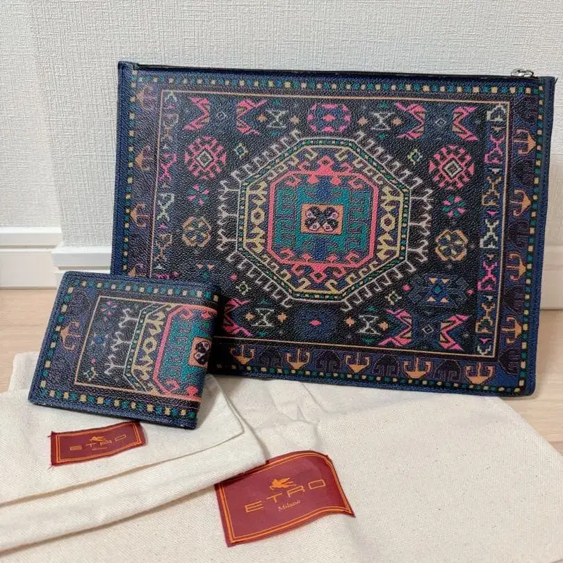 다색의 기하학 패턴이 특징인 접이식 지갑. - 사이즈: 세로 9cm x 가로 11cm(접이식 상태) - 부속품: 수납 봉투 포함 - 디자인: 접이식 지갑 방문해 주셔서 감사합니다. ETRO의 접이식 지갑(동전 지갑 없음)입니다. 클러치백도 함께 판매 중이니, 세트로 구매하시면 약간의 가격 인하를 해드리겠습니다. 소유주가 결벽증이 있어 깨끗하게 사용했지만, 모서리에 스크래치가 있습니다.