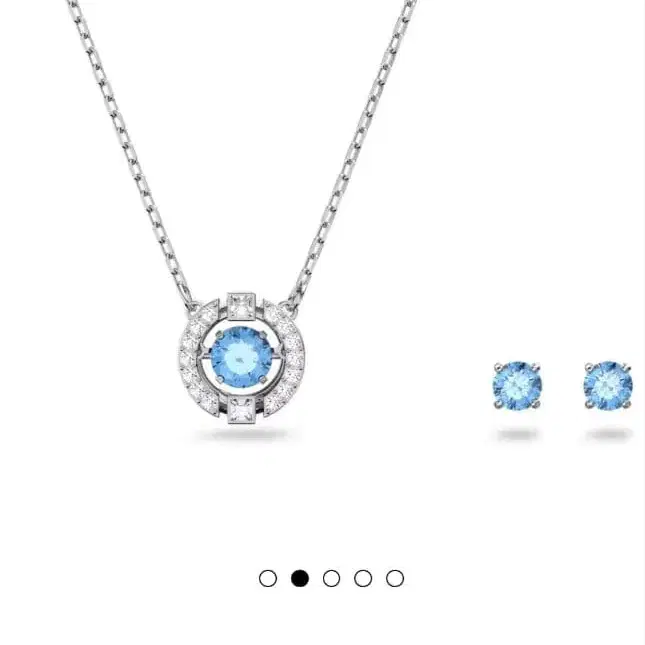 어머니날의 센스 있는 기프트로 완벽한 스터드 귀걸이와 목걸이 세트입니다. 혁신적인 [ 댄싱 크리스탈 ] 컨셉이 특징으로, 파베 세팅된 원형 모티브 안에서 파스텔 블루 컬러의 컷 스톤이 떠 있는 듯 반짝이는 세련되고 엘레강트한 디자인으로 완성했습니다. 로듐 코팅을 더한 위트 있는 럭셔리한 분위기의 주얼리입니다.
