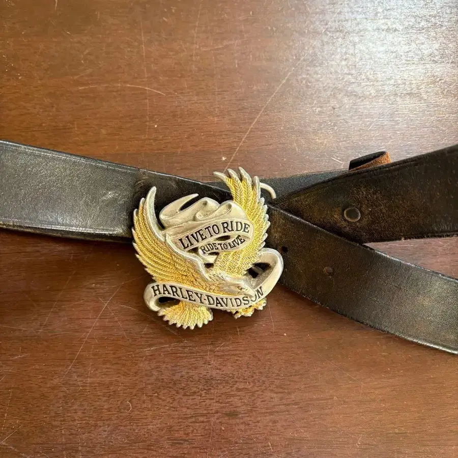 할리데이비슨의 가죽 벨트, 1991년산 날개 달린 독수리 버클 포함. - 브랜드: Harley-Davidson - 디자인: Live to Ride, Ride to Live - 소재: 가죽 - 버클 디자인: 날개 달린 독수리 디자인 - 제조년도: 1991년 방문해 주셔서 감사합니다.