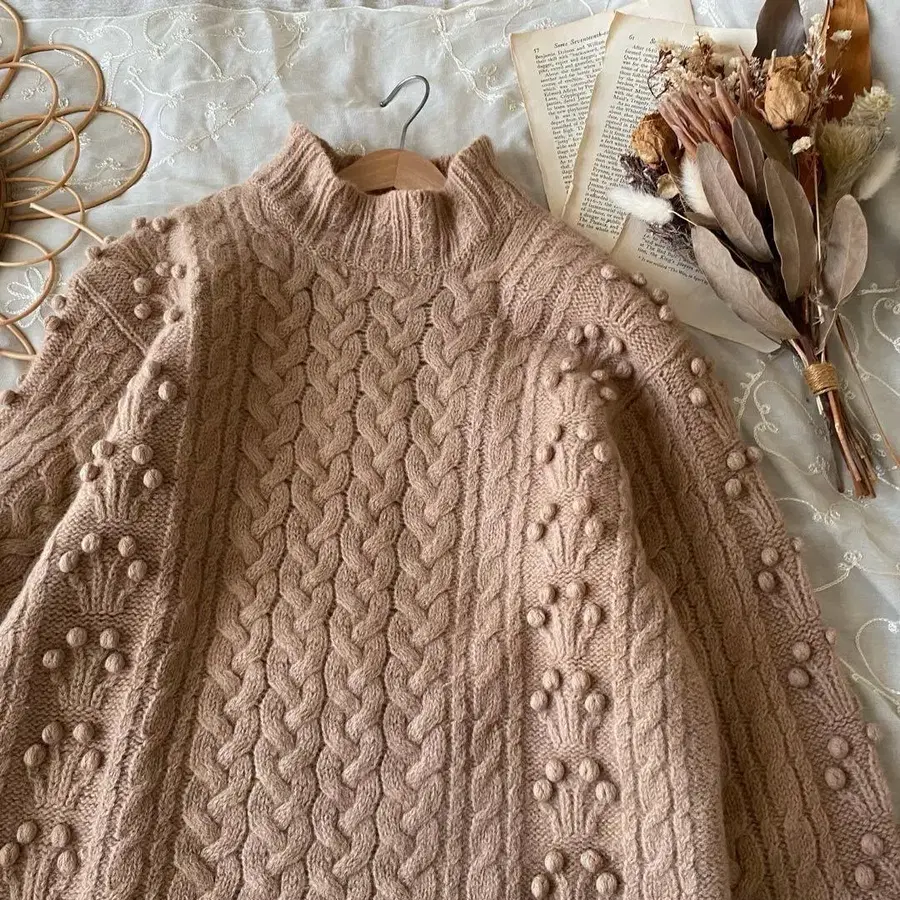 빈티지 구제 의류 폼폼 하이넥 케이블 짜임 울 니트