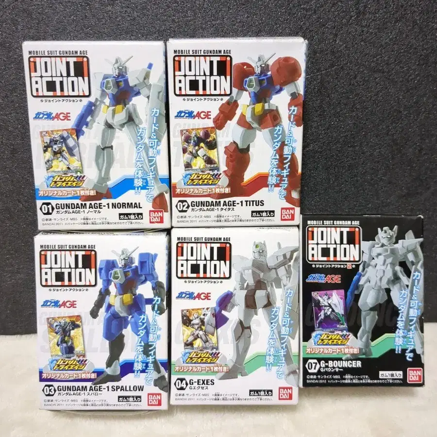 건담 AGE 조인트 액션 5개 세트입니다. 가동 피규어와 건담 트라이 에이지 카드가 들어있습니다. 상자는 개봉했지만 내용물은 미개봉입니다. 낱개 판매는 하지 않습니다.