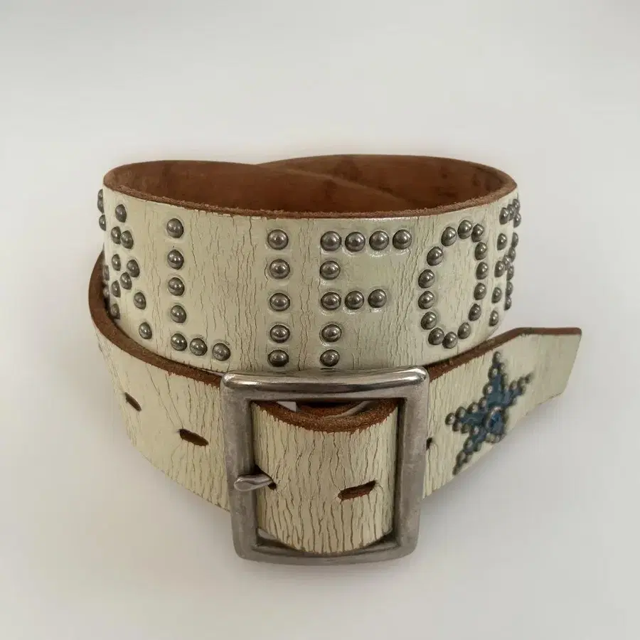 스터드와 별 모양 장식이 특징인 가죽 벨트. - 디자인: 스터드 장식, 별 모양 디자인 - 색상: 화이트, 블루 - 버클: 메탈 소재, 실버 색상 - 소재: 가죽 Standard California 에서 #htc #standardcalifornia 방문해 주셔서 감사합니다.