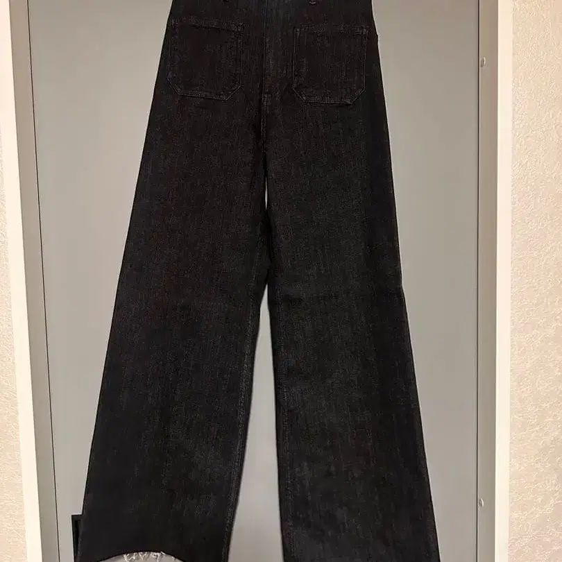 블랙 네이비 와이드 데님 팬츠, 프린지 밑단으로 스타일리시합니다. 하이웨스트에 가깝습니다! 핏도 매우 깔끔해서, 깔끔한 스타일, 캐주얼 스타일 둘 다 좋습니다. 외부 착용은 없습니다. 편하게 문의해주세요!!