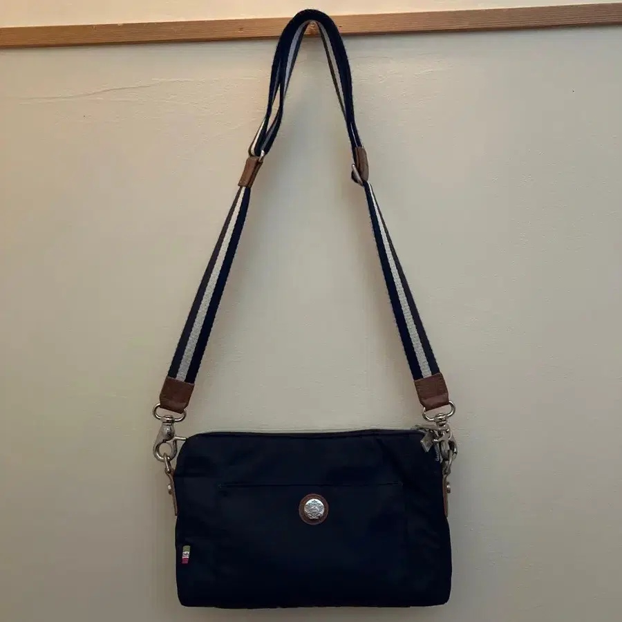 네이비 색상의 나일론 소재 숄더백입니다. 조정 가능한 스트랩과 가죽 악센트가 특징입니다.