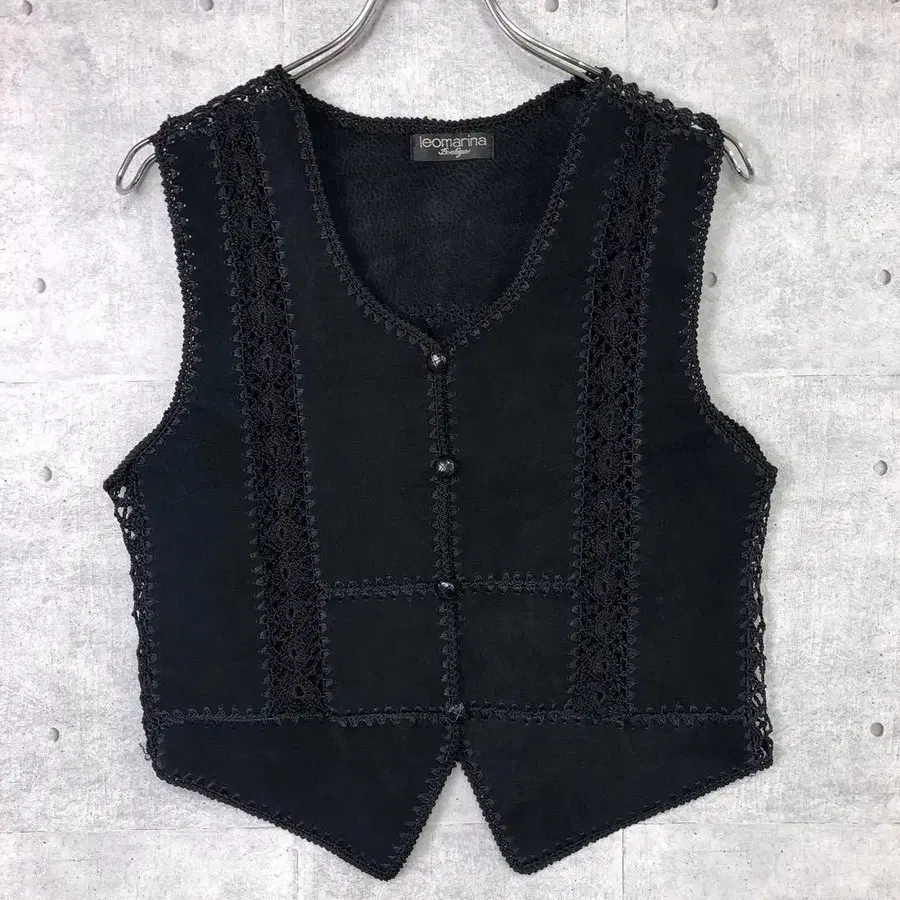 보헤미안 구제 의류 크로쉐 니트 절개 피그스킨 가죽 패치워크 베스트
