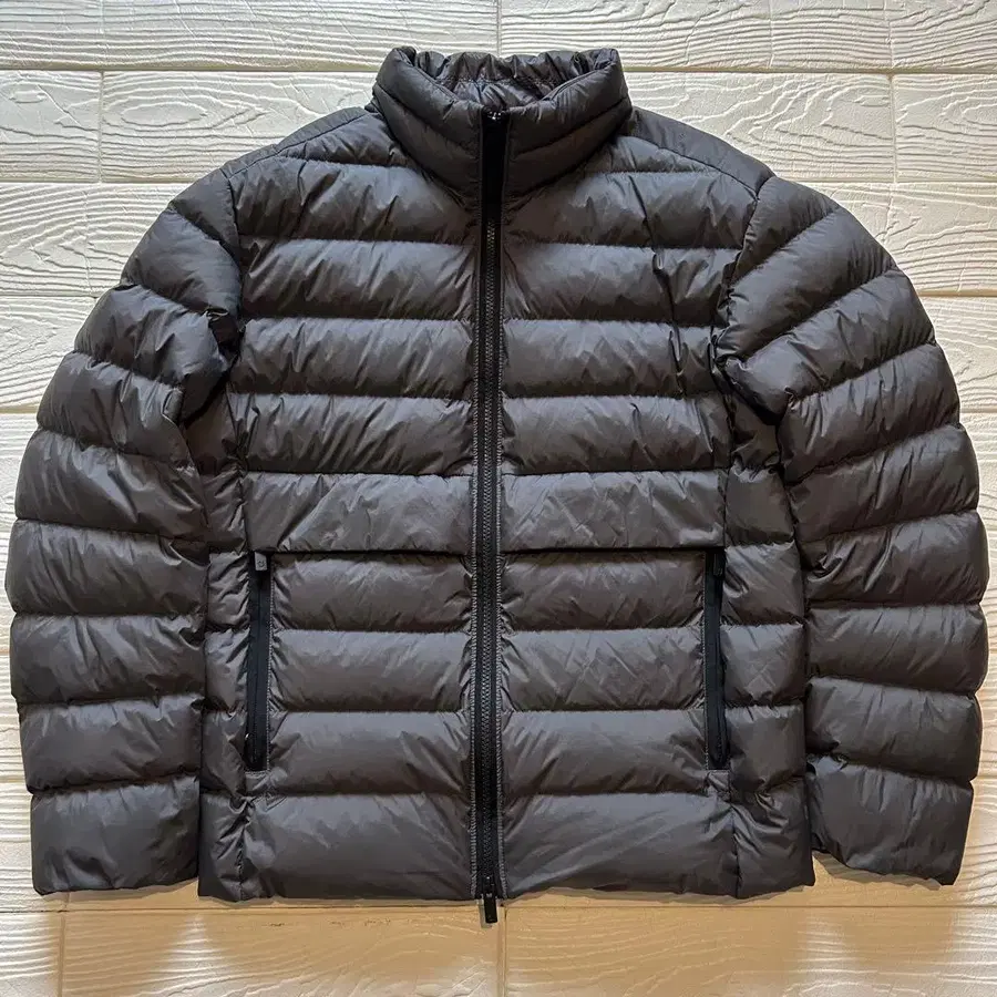 다크 그레이 색상의 퀼팅 다운 자켓으로, 풀 집업과 사이드 포켓이 있습니다.