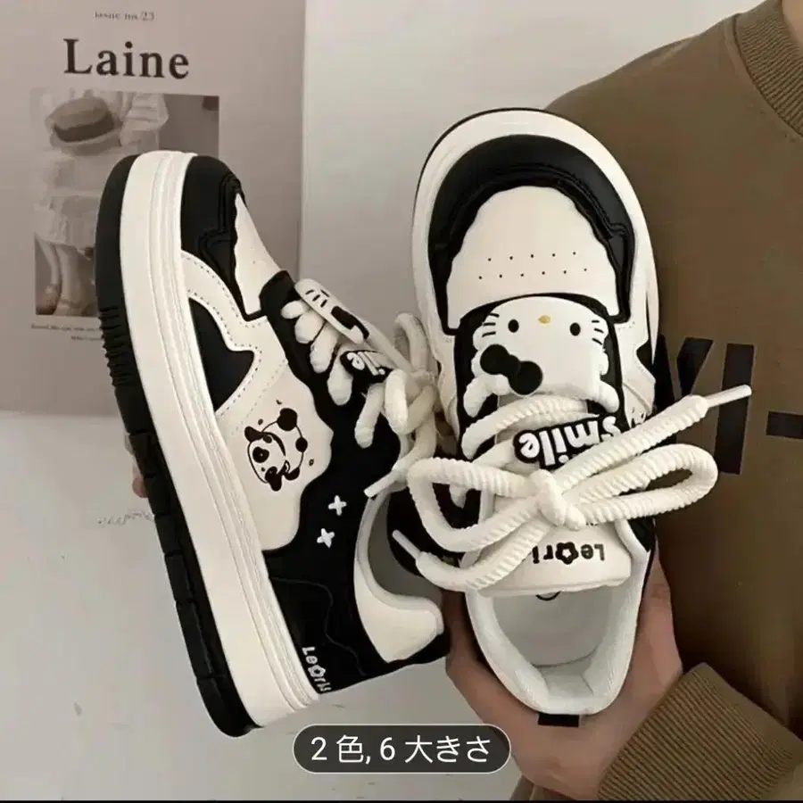 키티와 팬더 모티브의 캐주얼 스니커즈, 통굽 디자인으로 스타일리시. - 색상: 블랙/화이트 - 사이즈: 24cm - 디자인: 팬더와 키티 모티브 - 스타일: 캐주얼 - 신발끈: 두꺼운 신발끈 - 밑창: 통굽 - 특징: 웃는 얼굴 디자인 방문해 주셔서 감사합니다. 실내에서 잠시 신었습니다. 저에게는 조금 작아서 판매합니다. 다리 너비가 넓은 분에게는 맞지 않습니다. 보통 다리 너비라면 괜찮을 것 같습니다.