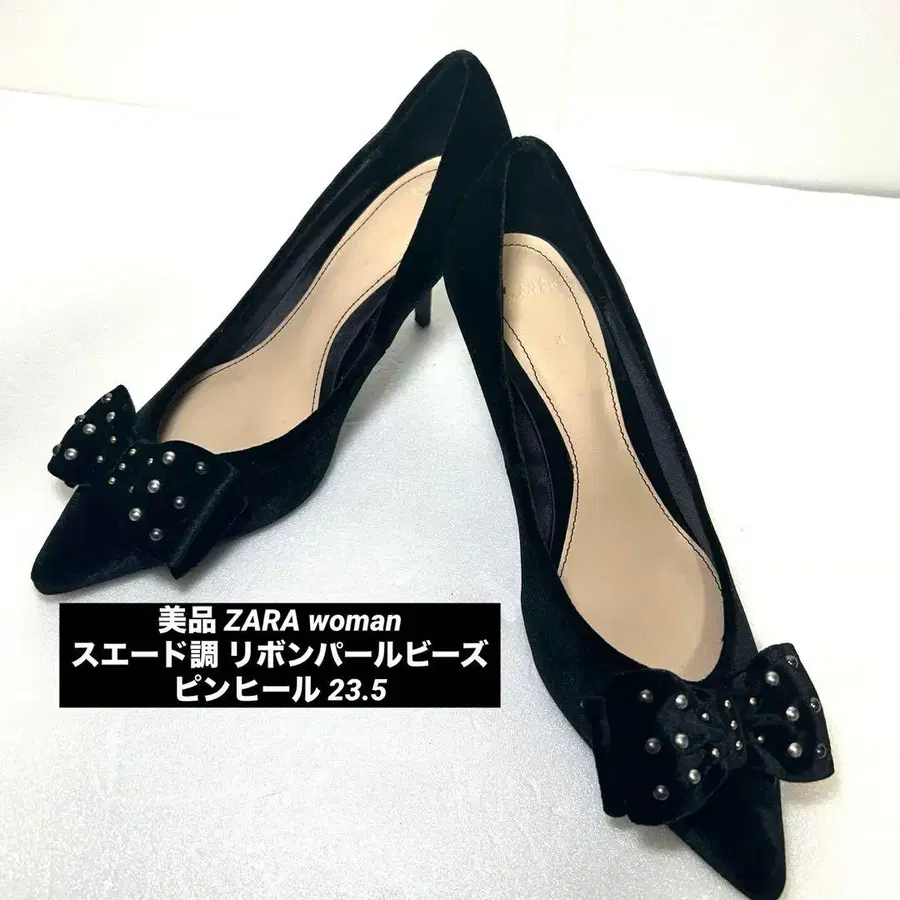 새상품급 ZARA woman 스웨이드 느낌 리본 펄 비즈 핑힐 23.5