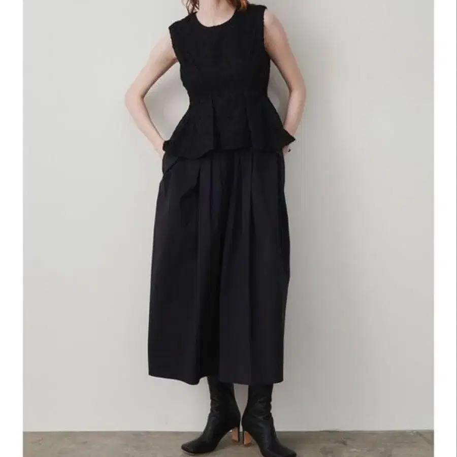 포멀한 장소에 추천하는 셋업풍 원피스로, 상의 부분은 페플럼 실루엣으로 허리가 예쁘게 보입니다.