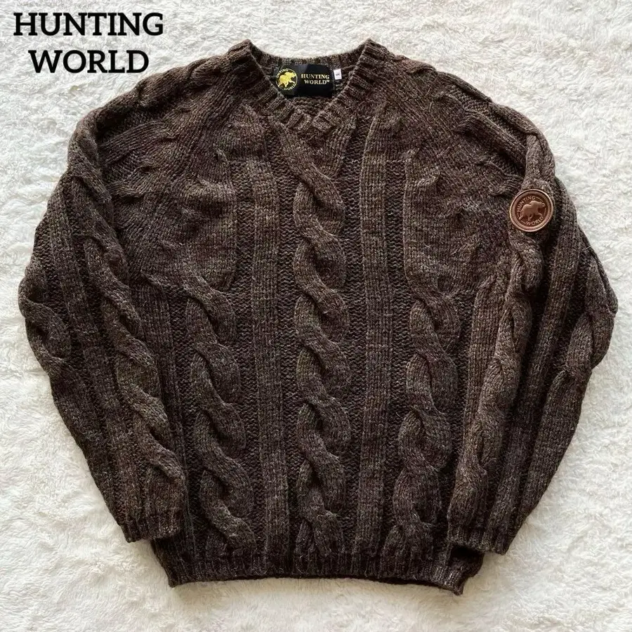 HUNTING WORLD 케이블 니트 울 가죽 와펜 브라운 S
