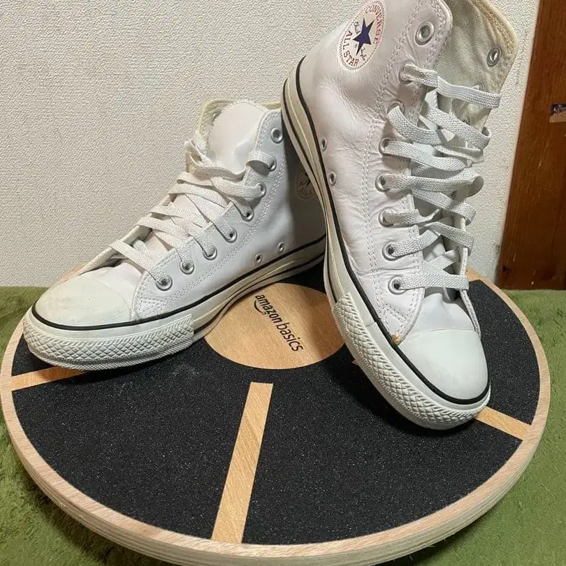 화이트 하이컷 스니커즈, 러버 솔. - 브랜드: Converse - 색상: 화이트 - 모델: 1B907 - 스타일: 하이컷 - 밑창 소재: 러버 - 생산국: 인도네시아 방문해 주셔서 감사합니다. 6~7년 전 ABC 마트에서 구매했습니다. 많이 신을 기회가 없어서 비교적 깨끗하지만, 사진 7, 8, 9번째와 같은 얼룩이 있습니다. 신발끈은 100엔 샵의 늘어나는 고무끈으로 바꿨기 때문에, 필요 없으시면 빼겠습니다. 신발 세정제와 브러쉬로 세척 완료했습니다. ※ 구매 시 신발 박스를 잃어버렸기 때문에, 다른 신발 박스나 종이상자로 포장하겠습니다. 사이즈: 26.5cm