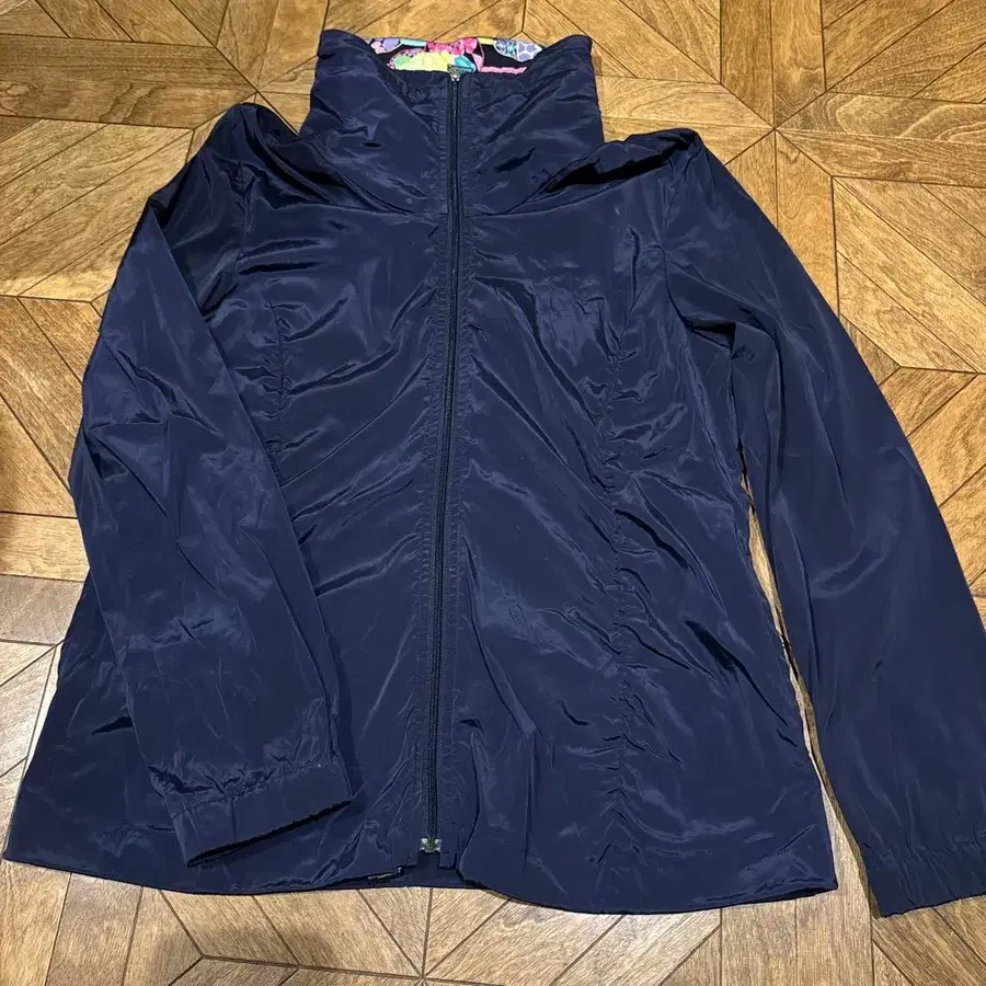 풀 지퍼의 블랙 자켓, 스탠딩 칼라와 개더가 특징입니다.