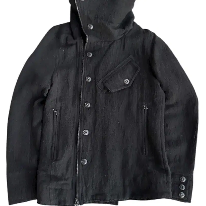 버튼, 지퍼 2가지 패턴으로 착용 가능한 하이넥 사양의 자켓입니다. 더블 지퍼 사양이므로, 상당히 폭넓게 실루엣 조정이 가능합니다. 가슴 너비 49 기장 67 어깨 너비 40 소매 길이 66