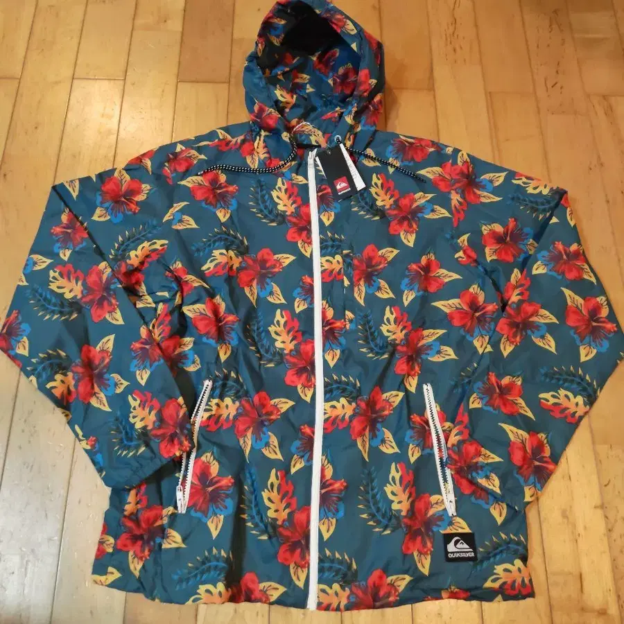 퀵실버 윈드브레이커 속기모 왼쪽 가슴에 안쪽 포켓, 바깥쪽 포켓 있음 올 패턴 하이비스커스 사이즈: L 새상품, 미사용