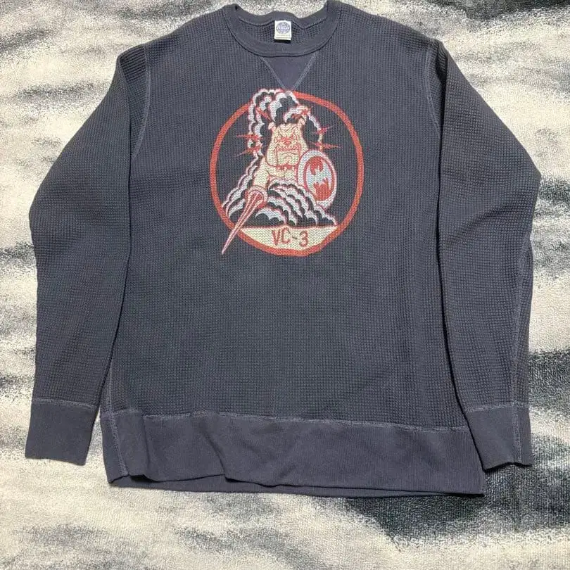 VC-3의 와플 서멀 롱 티셔츠입니다. 네이비 컬러이며, 프론트에는 특징적인 프린트가 되어 있습니다.